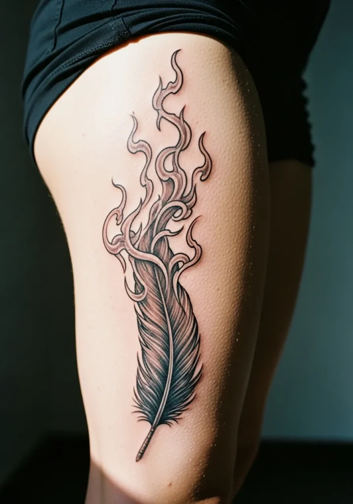 This thigh tattoo shows a long feather in black and grey realism with soft lines that turn into swirling smoke. The feather sits lightly on the skin while the smoke curls upward in fine wisps. The size is tall and elegant which makes the whole design flow beautifully along the leg.