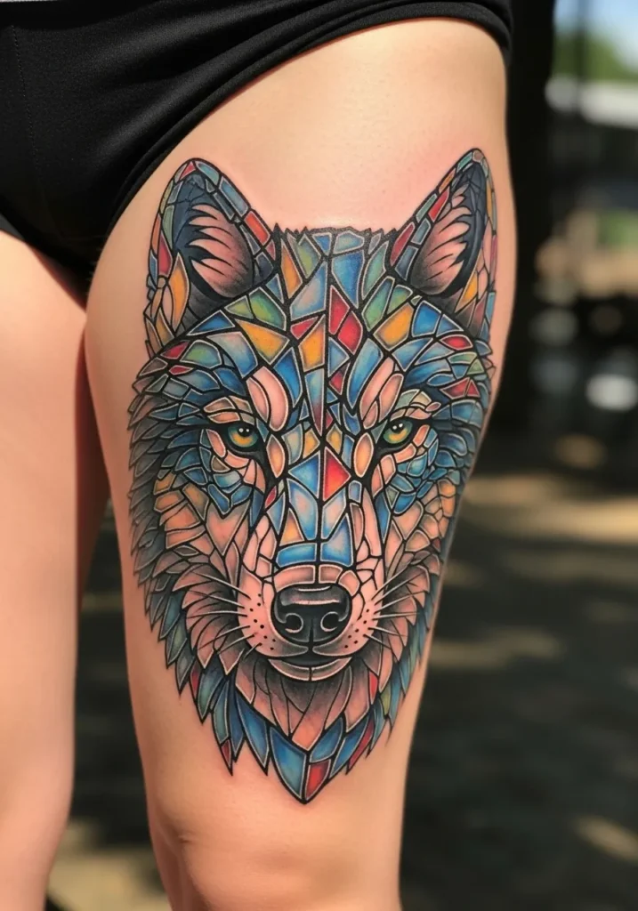 This thigh tattoo shows a wolf face filled with stained glass style panels. Each section carries bright color from blues to reds to warm gold tones. The lines are bold and the face has a striking symmetry. The size is large enough to show every tiny shard like a real window.