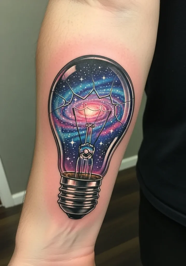 This inner arm tattoo features a clear lightbulb filled with a swirling galaxy in vivid purples and blues. The cracked glass effect adds texture while the glowing stars make the scene look alive. The metal base reflects light with smooth shading which adds even more realism.