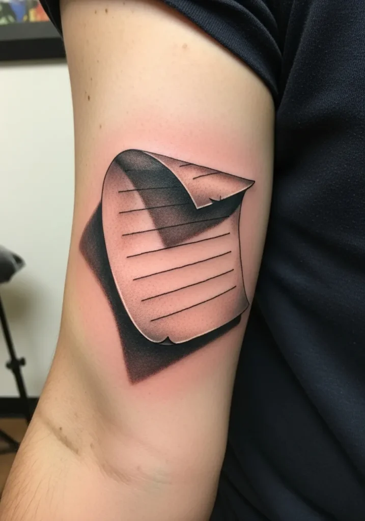 This upper arm tattoo features a curled sheet of paper with shadow work that creates a lifted look. The lines are clean and crisp with a simple black and grey palette. The curved corner and shading make the paper look like it is peeling off the skin.