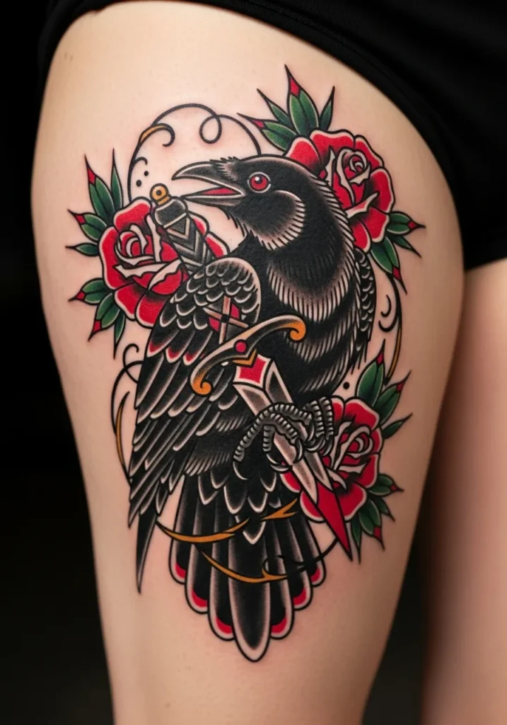 This thigh tattoo showcases a detailed raven gripping a dagger, framed by bright red roses and green leaves. The mix of bold black ink with vibrant reds and gold touches gives it that perfect American Traditional look. The size and placement make it dramatic but still elegant, wrapping naturally around the thigh.