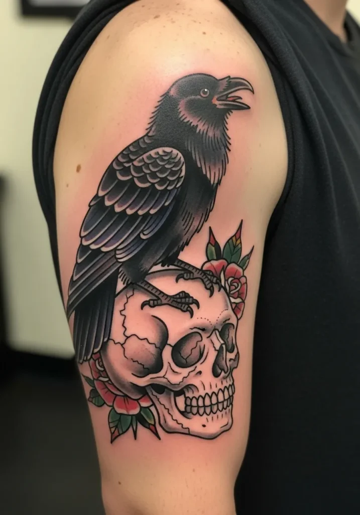This American Traditional tattoo shows a black raven perched on a skull surrounded by red and green flowers. It s inked on the upper arm, giving it a powerful and balanced look. The design mixes thick black lines, smooth shading, and pops of color that bring the flowers and bones to life against the skin. The size is medium to large, perfect for showing off the details of both the bird and the skull.