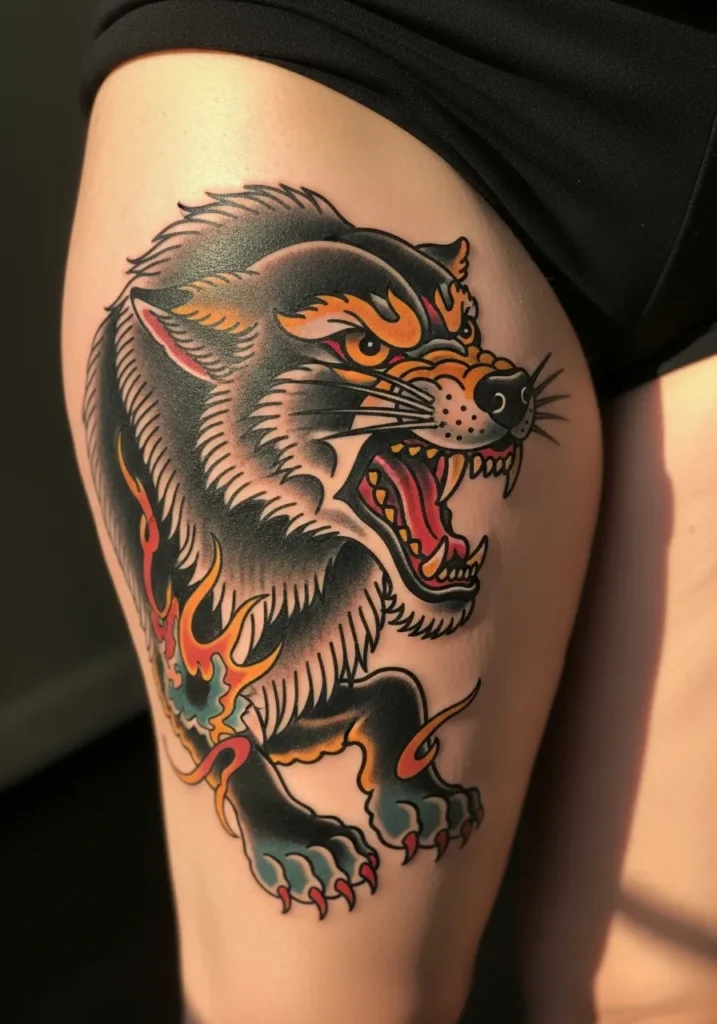 This large thigh tattoo features a full-bodied wolf mid-snarl, surrounded by flames and done in vivid traditional colors of orange, yellow, and teal. The heavy black outlines and rich shading give it that unmistakable American Traditional boldness, while the thigh placement allows for a wide, detailed design.
