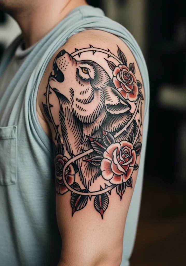 This detailed shoulder tattoo features a howling wolf surrounded by blooming red roses and twisting thorny vines. The bold black lines, warm red hues, and meticulous shading give it that perfect American Traditional vibe while softening the fierce wolf with floral elegance.