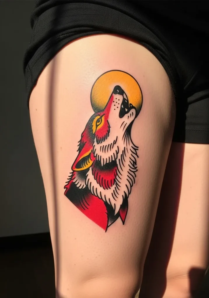 This thigh tattoo shows a howling wolf gazing up at a glowing golden moon, surrounded by deep red and black tones that give it dramatic contrast. The smooth shading and clean outline make it unmistakably Traditional, and the placement on the thigh gives it room to breathe and shine.