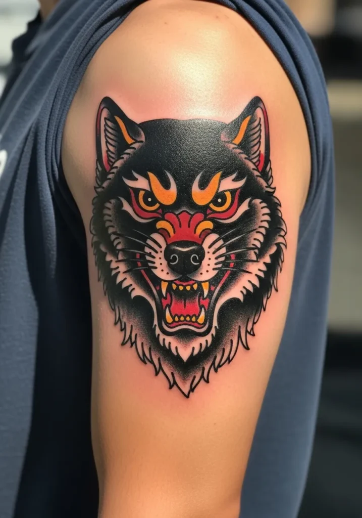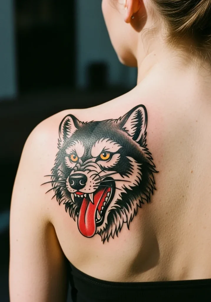 This American Traditional wolf tattoo sits beautifully on the upper back and shoulder, showing off bold black outlines, clean shading, and fiery touches of red in the open mouth and tongue. The wolf s golden eyes add a spark of attitude that pairs perfectly with the confident placement. It s medium-sized, and the crisp detailing gives it a polished, timeless look.