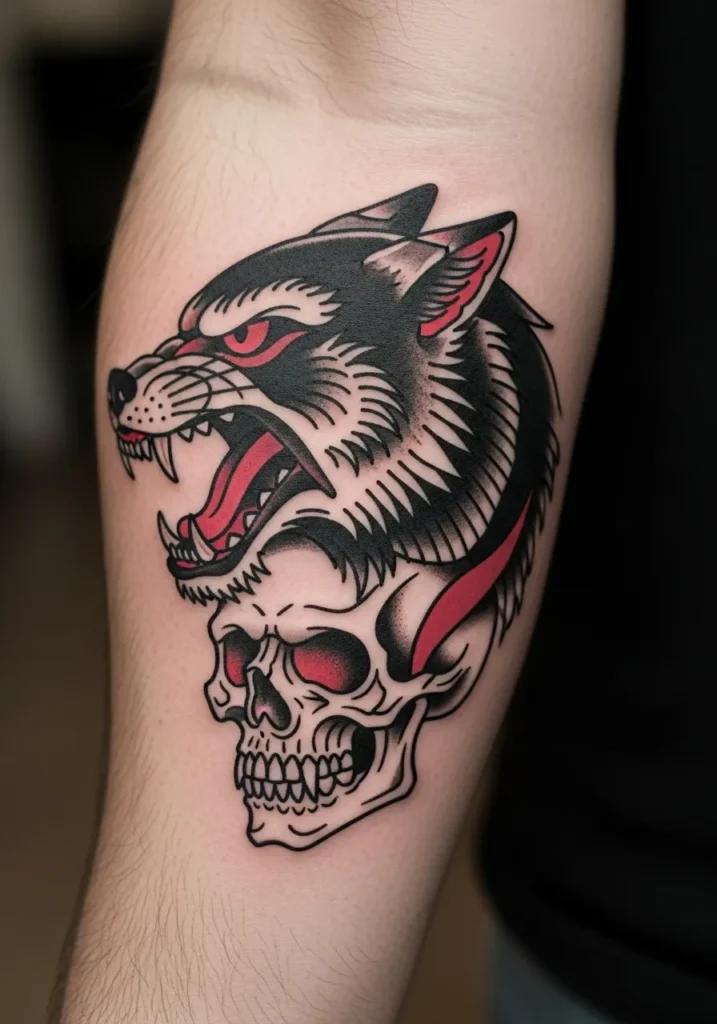 This powerful arm piece features a snarling wolf paired with a human skull underneath, both drawn in classic American Traditional fashion. The heavy black lines, bold reds, and perfect gradient shading give it an intense and fearless energy. The design fits perfectly along the arm s curve, making it feel strong and balanced.