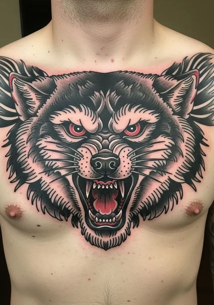 This striking American Traditional wolf tattoo takes over the entire chest with a bold, symmetrical layout that demands attention. The design features an open-mouthed wolf head, teeth bared and eyes blazing red, outlined with heavy black ink and filled with smooth shading in grey tones and soft pink undertones. It s a large-scale tattoo that perfectly fits the chest s natural shape, framed by the shoulders for balance.