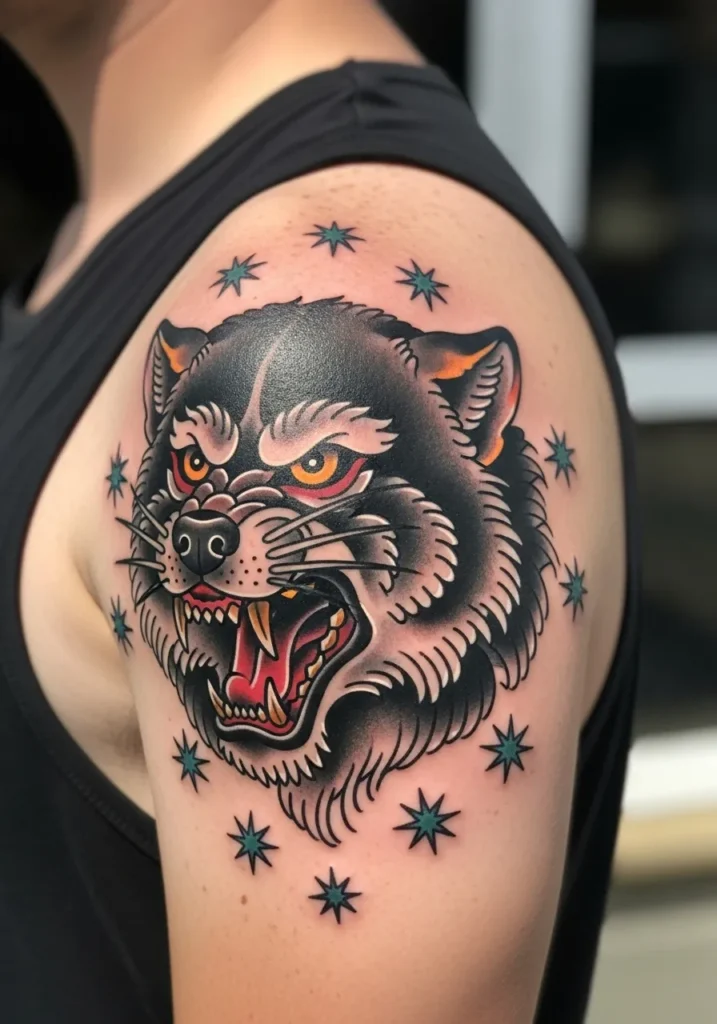 This bold shoulder tattoo features a snarling wolf framed by a halo of tiny blue stars. The heavy shading, deep blacks, and bright pops of color give it a bold and dramatic feel. It sits perfectly on the shoulder, creating a rounded, balanced look that moves naturally with the body.