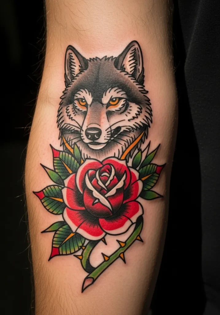 This forearm tattoo pairs a detailed wolf head with a bright red rose underneath, connected by a thorned stem. The contrasting black shading of the wolf against the vibrant reds and greens of the rose gives it that classic American Traditional look everyone adores.
