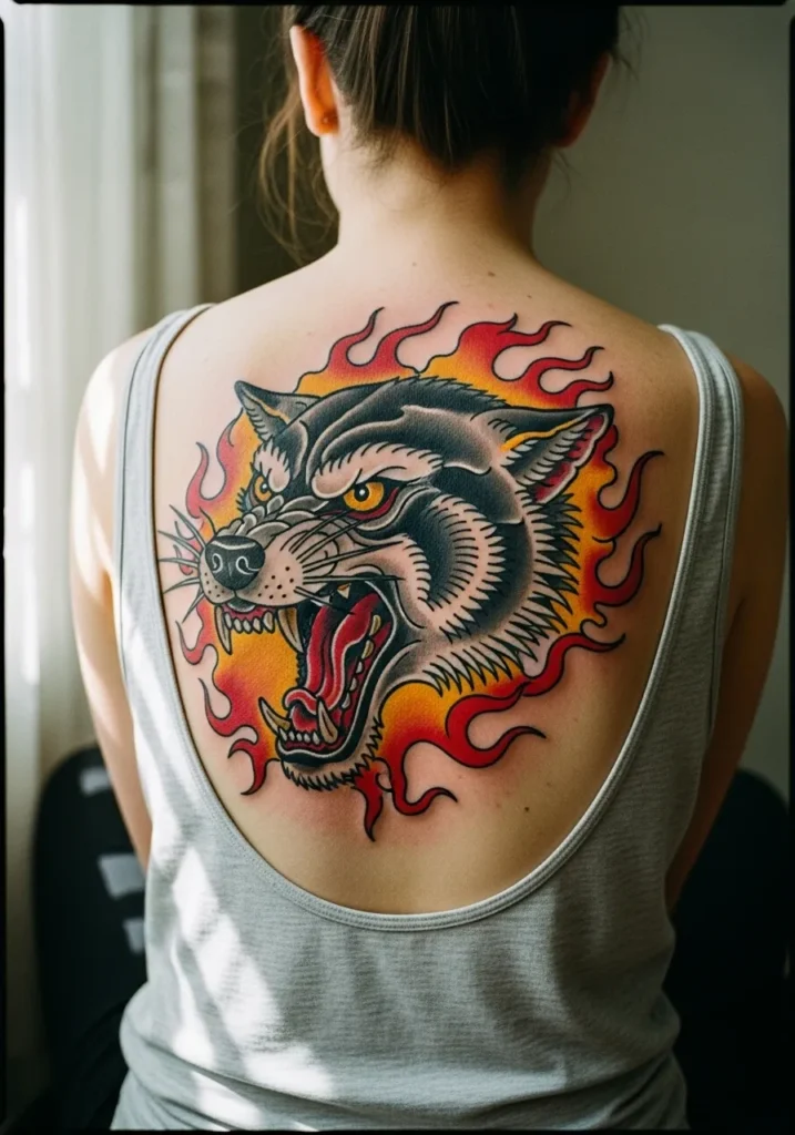 This dramatic back tattoo shows a snarling wolf surrounded by blazing flames that glow in shades of red, orange, and yellow. The heavy black outlines, bold shading, and vibrant colors make it a perfect example of American Traditional artistry. It s large enough to cover most of the upper back, turning the skin into a fiery canvas of strength and spirit.