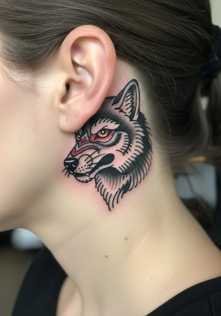 This small yet fierce tattoo sits just below the ear, featuring a sleek wolf head in crisp black and grey tones with a hint of red and orange detailing. The sharp lines and compact size make it look both edgy and elegant, proving that even tiny tattoos can carry a big attitude.