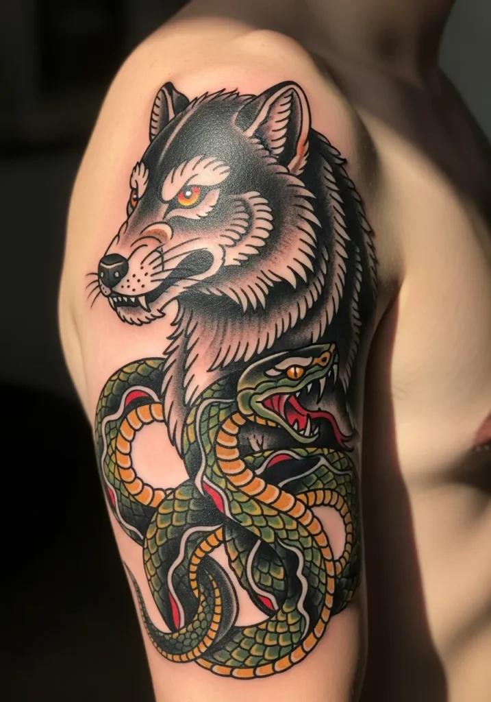 This upper-arm tattoo features an intense scene of a wolf entangled with a serpent. The artist uses the bold American Traditional palette deep black, forest green, gold, and hints of red to create a powerful contrast. The wolf s snarl and the snake s coiled body make this piece feel alive with tension.