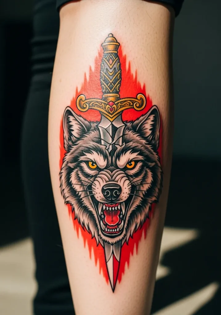This leg tattoo features a snarling wolf with a golden dagger piercing through its head, framed by bright red flames in the background. The traditional color palette gold, black, red, and white makes it instantly recognizable as an American Traditional classic. The placement on the calf gives it a strong, vertical look.