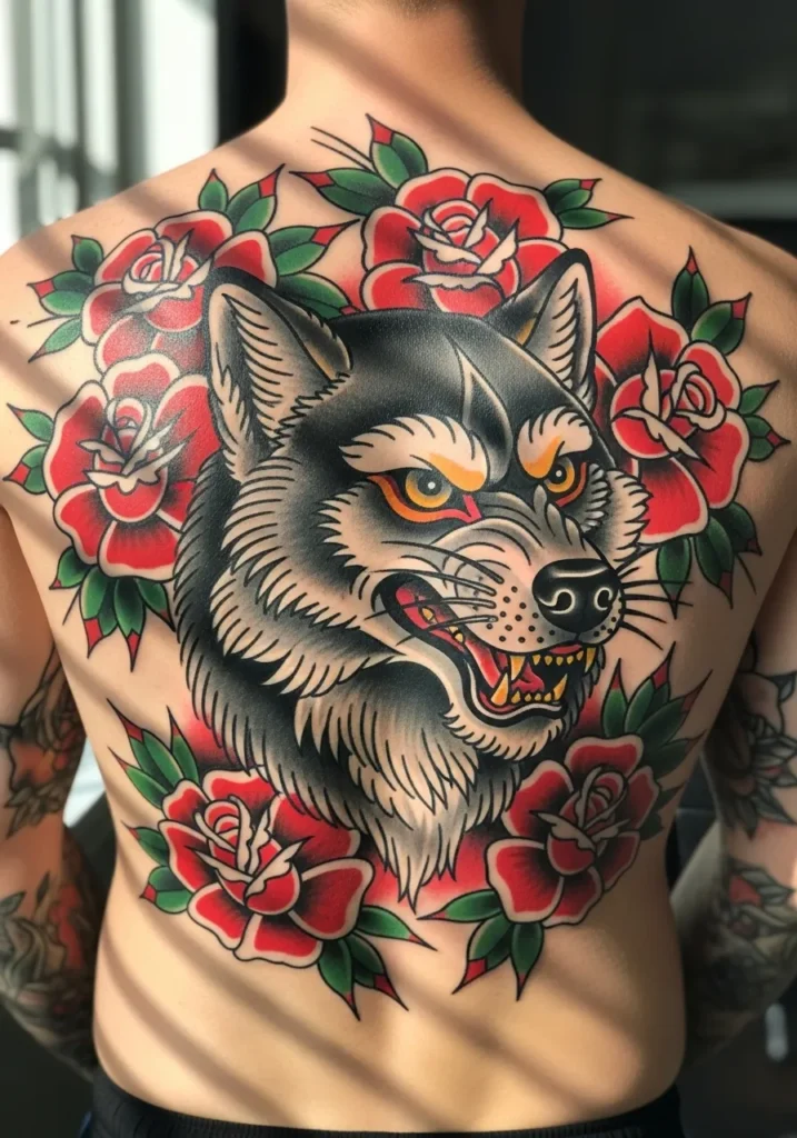 This full back piece is absolutely stunning, with a large wolf head surrounded by red roses and green leaves. The black and gray shading gives the wolf depth, while the roses pop with traditional red and green vibrancy. The scale and symmetry make this tattoo a true statement piece that radiates power and elegance.