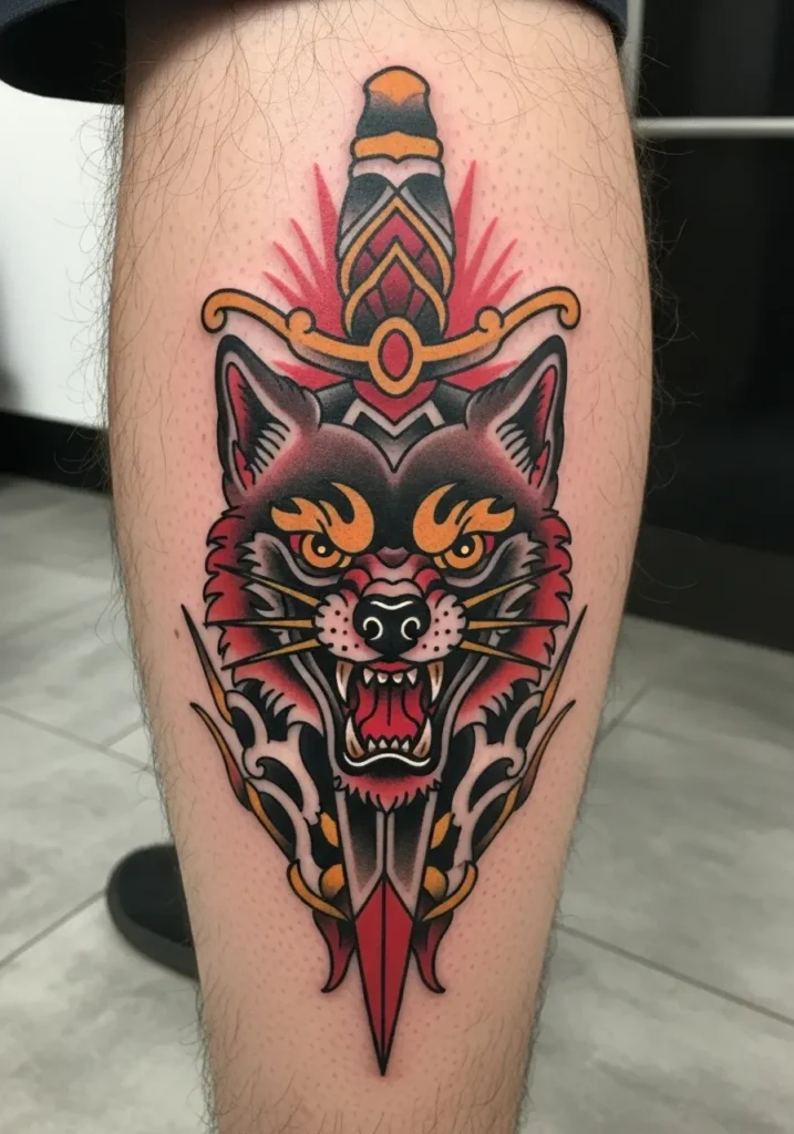 This design blends two old-school classics a wolf and a dagger in perfect harmony. Inked on the lower leg, the tattoo features a fierce wolf head pierced by an ornate dagger, glowing with rich reds, golden yellows, and deep blacks. The clean, symmetrical structure and bold lines make it unmistakably American Traditional.