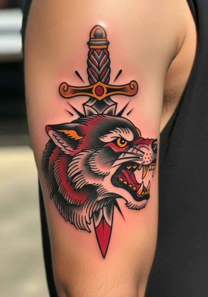 This bold shoulder tattoo shows a fierce wolf s head pierced by a golden dagger, with the design framed in rich reds and blacks. The clean lines and heavy shading make it a textbook example of American Traditional strength. It sits perfectly on the upper arm, giving it a powerful, structured look.