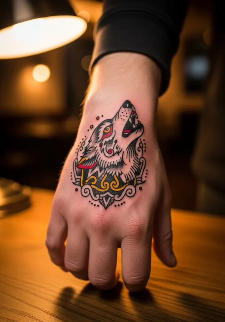 This small but eye-catching tattoo sits right on the top of the hand, featuring a howling wolf surrounded by ornate golden and black decorative patterns. The use of bright red accents adds warmth and energy, while the bold outlines keep it looking sharp and crisp.