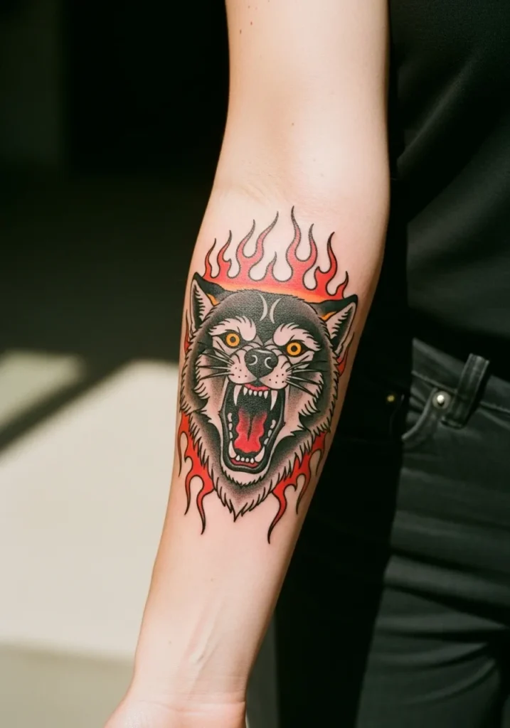This fiery forearm tattoo captures the wild side of traditional design with a snarling wolf surrounded by bright red and orange flames. The bold black outlines and saturated colors give it that classic American Traditional punch, while the placement on the outer forearm keeps it visible and fierce without being overwhelming.
