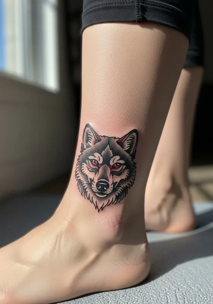 This ankle tattoo is proof that small tattoos can still carry serious impact. The wolf s head is drawn in a simplified American Traditional style with bold lines, dark shading, and subtle red eyes that bring a touch of intensity. The placement right above the ankle bone makes it cute but confident.