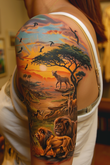This breathtaking Lion King sleeve tattoo captures the wild beauty of the African savannah in full cinematic glory. The rich sunset sky glows in shades of orange and purple as silhouettes of birds fly across the horizon. Below, a stunning scene unfolds with Mufasa and Simba standing proud, surrounded by lush trees, cliffs, and the winding rivers of the Pride Lands. Every detail feels straight out of the film, from the acacia tree shadows to the intense expression in the lions eyes.