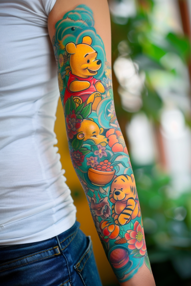 Winnie the Pooh Colorful Garden Sleeve Tattoo