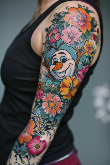 I seriously adore this tattoo because it s so playful and full of life. Olaf surrounded by flowers feels so whimsical and cheerful, making it impossible not to smile whenever you look at it. If you love Frozen or simply want a tattoo that s packed with happy vibes, this cute floral Olaf sleeve might be your next favorite thing.