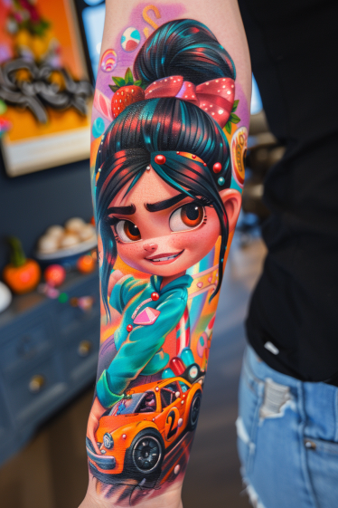 This bright and cheerful sleeve tattoo stars Vanellope Von Schweetz from Disney s Wreck-It Ralph in all her adorable, candy-coated glory. Bursting with vivid pinks, blues, and oranges, Vanellope flashes her mischievous grin alongside her vibrant, candy-themed race car. Colorful sweets, sprinkles, and her iconic hair accessories bring the sugary Sugar Rush vibes to life, creating an irresistibly playful tattoo design.