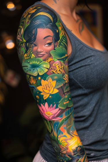 This vibrant sleeve tattoo brings Princess Tiana to life in the heart of her magical bayou. She peeks out playfully from behind glowing lily pads and golden lotus flowers, surrounded by rich greens, sparkling stars, and a cozy, moonlit swamp scene unfolding below. Frogs, fireflies, and swirling water details make this feel like an enchanted southern fairy tale happening right on your arm.