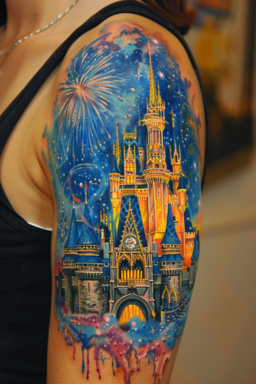 If you re anything like me, just one glance at this tattoo instantly transports you to your childhood dreams. I absolutely love how detailed and whimsical this design is. The vibrant colors and magical fireworks really bring the Disney experience to life. Honestly, it s like wearing a bit of happily-ever-after wherever you go.