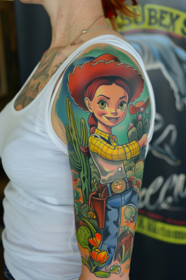 This lively tattoo features Jessie from Toy Story, confidently strolling through a vibrant desert landscape. The bold colors perfectly capture Jessie s playful, adventurous personality alongside quirky cacti, blooming flowers, and a cheerful western vibe. Rich greens, sunny yellows, and her classic cowgirl outfit all blend beautifully, making this tattoo a bright and joyful tribute to everyone s favorite cowgirl.
