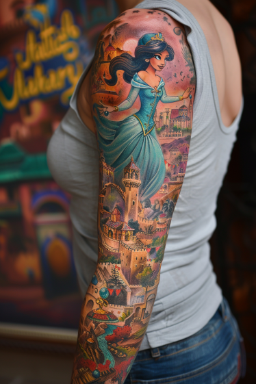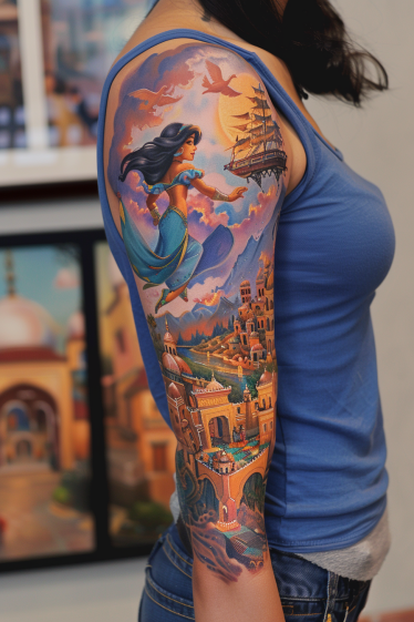 This dreamy sleeve tattoo features Princess Jasmine gracefully standing over a stunning, detailed view of Agrabah. The tattoo showcases Jasmine s flowing teal dress and confident pose surrounded by beautifully intricate palace towers and charming city details. Soft, warm colors like golds and sandy browns blend wonderfully with Jasmine s signature blues, creating a scene filled with enchantment and wonder.