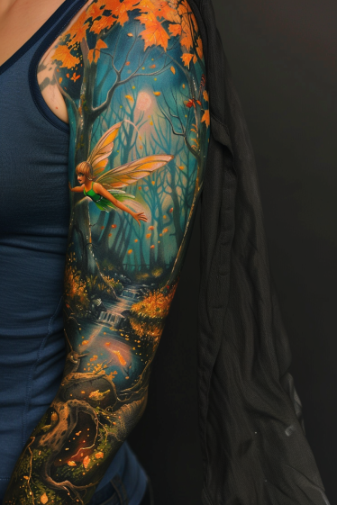 This tattoo sleeve beautifully showcases Tinker Bell gracefully soaring through an enchanted forest bursting with vibrant autumn hues. Rich golden-orange leaves float gently around her while intricate trees and a softly flowing stream add depth and magic to the scene. The style is vividly illustrative with a touch of fantasy charm, perfectly capturing the whimsical spirit of Disney and nature s beauty combined into one seamless masterpiece.
