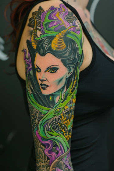 I m obsessed with how powerful this tattoo looks. It s not just beautiful, it s badass in the most unapologetic way. The colors practically glow off the skin and the energy of it is pure enchantress vibes. It s giving confident, mysterious, and untouchably cool all in one magical package. If you love a good villain moment, this one s iconic.