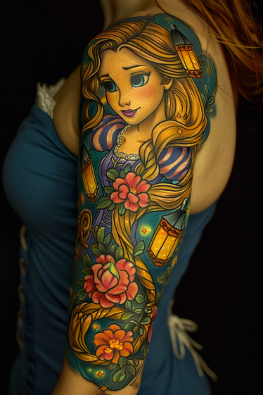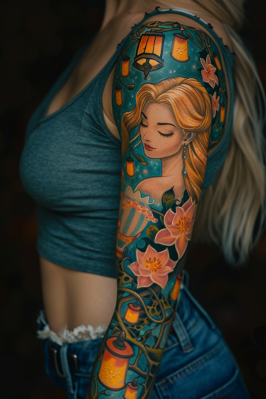 This dreamy sleeve tattoo perfectly captures the gentle beauty of Rapunzel from Disney s Tangled. Surrounded by softly glowing lanterns and delicate pink blossoms, Rapunzel s flowing blonde hair adds a touch of graceful movement to the tattoo. Rich, warm colors blend seamlessly with a deep teal background, creating a fairytale atmosphere that s romantic and whimsical all at once.
