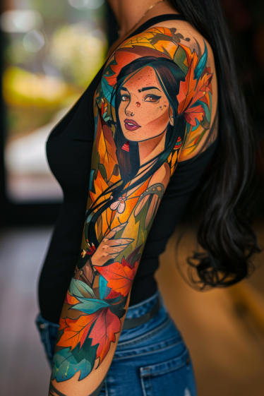 Pocahontas Autumn Leaves Sleeve Tattoo