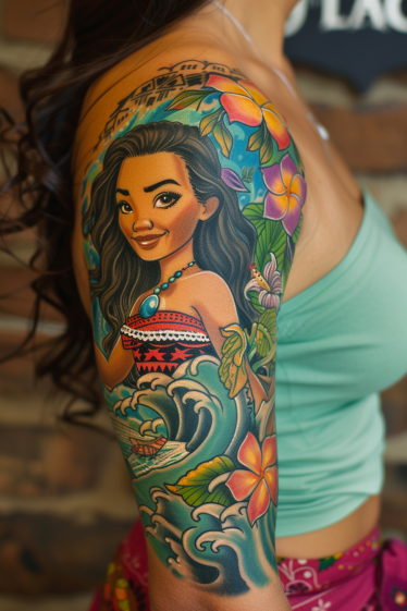 This stunning sleeve tattoo features Moana in her full adventurous glory, surrounded by crashing ocean waves and vibrant tropical flowers. Her expression is confident and radiant, with her signature necklace glowing front and center. The colorful backdrop of hibiscus blooms, swirling teal waves, and leafy greens brings the whole piece to life. There s even a tiny canoe tucked into the waves, tying it all back to her epic journey.