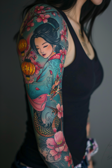 This graceful Mulan tattoo is a stunning mix of elegance and strength. Mulan is shown in a beautifully detailed kimono surrounded by soft pink cherry blossoms and delicate lanterns glowing with warm golden light. Flowing water, blooming florals, and gentle swirls of fabric create a balanced and feminine design full of movement and meaning.