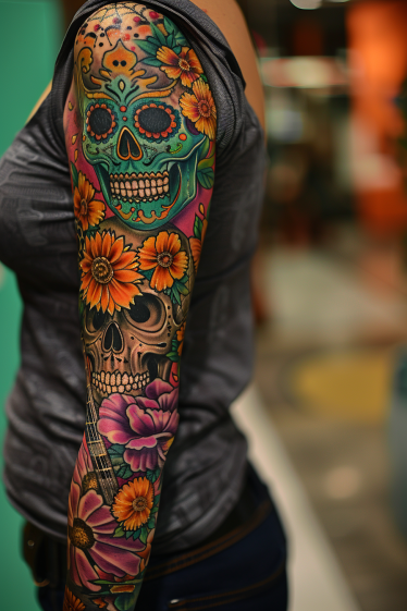 This vibrant sleeve tattoo takes inspiration from Disney s Coco with a striking, colorful sugar skull design complemented beautifully by bold floral accents. Rich teal, purples, and oranges create an eye-catching design that blends traditional DÃÂÂa de Muertos themes with a fresh, modern twist. Lush flowers surround intricately detailed skulls, bringing the lively spirit of Coco vividly to life on the skin.