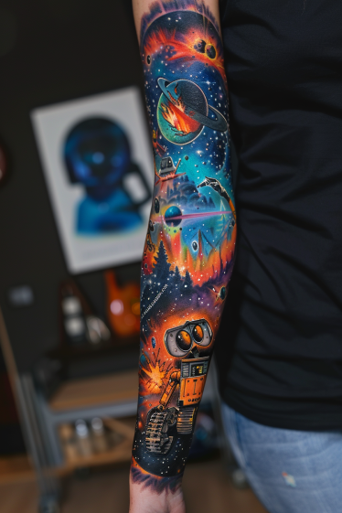 This tattoo seriously has me starry-eyed. It s like a little slice of space right on your arm. I love how WallE s personality shines through alongside the dreamy cosmic imagery. If you adore Disney, sci-fi adventures, or just want a tattoo that s genuinely out-of-this-world cute, this one ticks all the boxes.