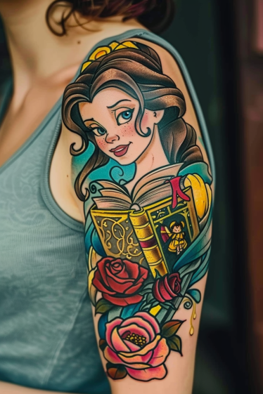 This delightful tattoo features Belle from Beauty and the Beast in a charming, storybook style. Belle s gentle expression and flowing hair pair beautifully with her beloved books and lush roses. Rich, vivid colors highlight every detail from the golden cover of the enchanted book to the romantic pink and red roses. It perfectly captures Belle s dreamy personality and her love for adventure hidden within stories.