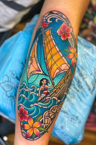 This stunning Moana-inspired tattoo features our brave heroine confidently sailing across vivid blue waves in her iconic boat. The vibrant sails flutter gently against the turquoise backdrop, accented beautifully by tropical hibiscus flowers. Bold outlines and rich colors give the design a fun, lively Polynesian vibe that captures Moana s adventurous spirit perfectly.