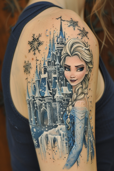 This stunning tattoo captures Elsa in all her frosty glory, framed by an icy blue castle and shimmering snowflakes floating in the air. Her signature braid drapes over her shoulder, and the sparkle in her gown practically twinkles with frozen magic. The artist nailed the fairytale vibe here, mixing soft blues, silvers, and whites to create a magical winter wonderland on skin. It s delicate yet bold, and the castle detail behind her looks like it was pulled straight from Arendelle.