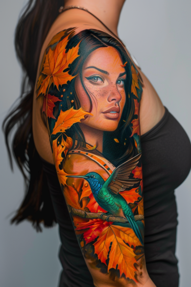 This gorgeous sleeve tattoo shows Pocahontas beautifully surrounded by vivid autumn leaves and an enchanting hummingbird. The warm orange and golden tones of the leaves perfectly complement Pocahontas s expressive eyes and flowing hair, while the vibrant blues and greens of the hummingbird add an eye-catching contrast. The entire design captures the gentle spirit and natural beauty of Pocahontas in a striking, artistic way.