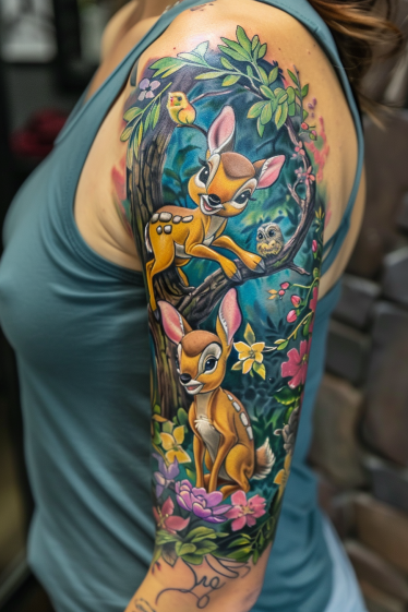Honestly, I think this tattoo is pure magic. The colors are amazing and create such a lively, dreamy vibe. If you love nature, Disney nostalgia, and sweet woodland animals, this sleeve hits all the right notes. It s like having a cheerful little forest adventure permanently inked on your arm, and who wouldn t want a bit of Bambi s sweetness brightening their day?