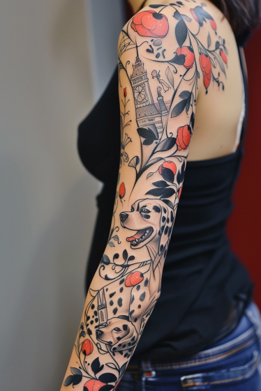 Dalmatians Floral and Parisian Sleeve Tattoo