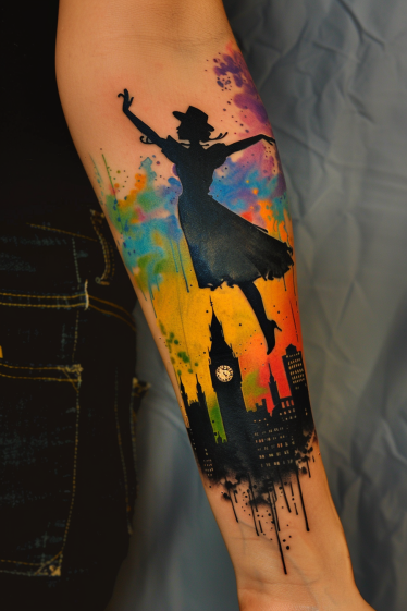 This bold forearm tattoo captures the silhouette of Mary Poppins soaring gracefully over a dreamy London skyline, umbrella in hand, of course. The cityscape is inked in rich black with delicate detailing around Big Ben, and it s set against a stunning watercolor explosion of orange, yellow, green, purple, and blue. The vibrant background makes the black silhouette pop in such a magical, theatrical way.