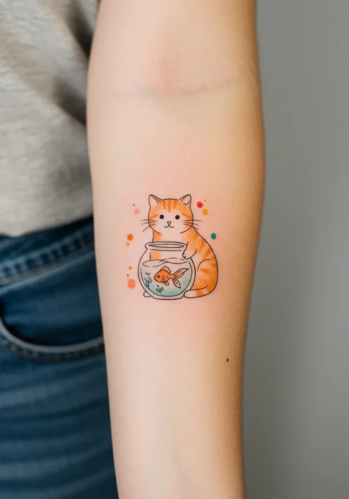 This adorable forearm tattoo features a wide-eyed orange tabby gently wrapped around a tiny fishbowl, clearly intrigued by the little goldfish swimming inside. The fine linework gives the design a sweet, hand-drawn feel, while pops of watercolor dots in orange, coral, and teal add a splash of playful charm. The overall look is clean, minimal, and packed with personality without being overly busy.