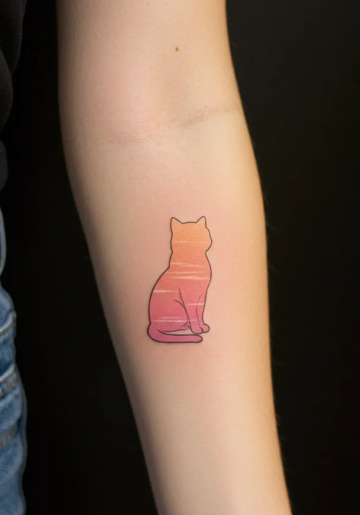 This simple yet dreamy tattoo shows the silhouette of a sitting cat filled with a gradient of warm sunset tones, fading from golden orange at the top to deep pink near the paws. The cat s outline is crisp and minimal, letting the soft sunset hues speak for themselves. Subtle texture lines across the body give it the look of clouds drifting through a sky, turning this tiny design into something that feels way bigger than its size. Placed neatly on the forearm, it s clean, calm, and full of quiet beauty.