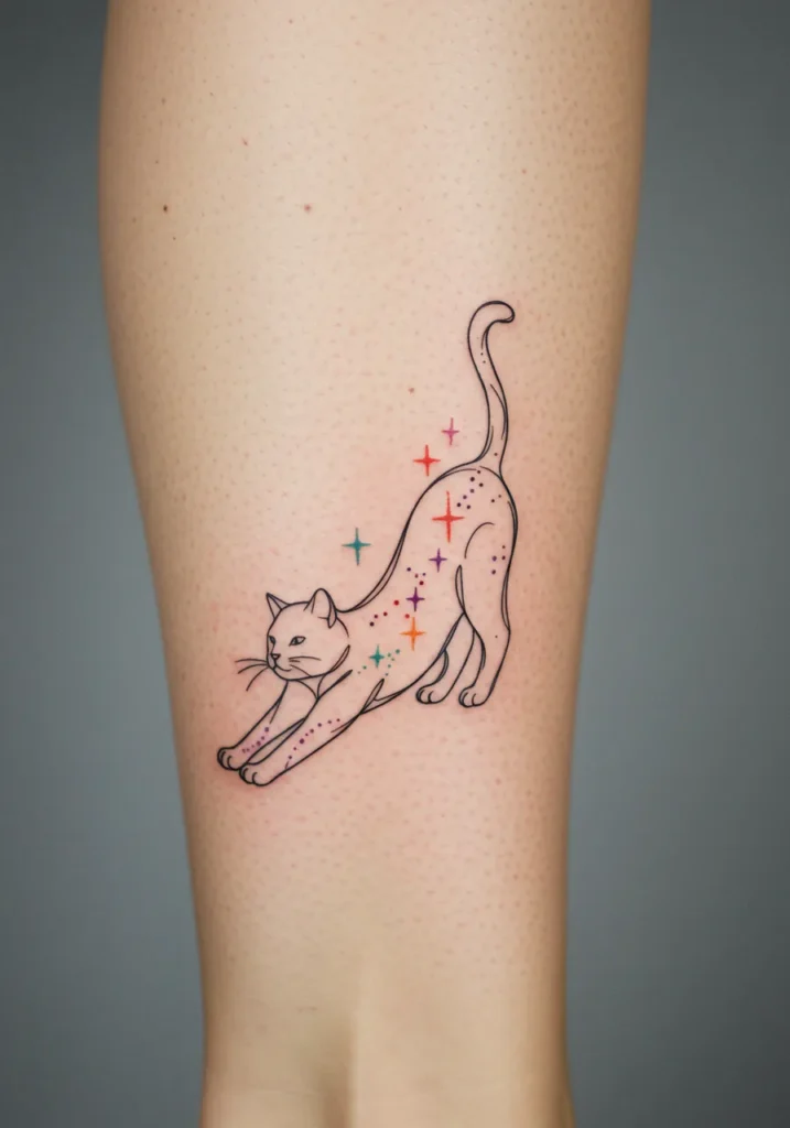 This tattoo shows a graceful fine line cat mid-stretch, tail high and paws extended, perfectly capturing that lazy feline elegance. The body is outlined in crisp black ink, but the real fun comes from the little burst of sparkles dancing along its back. These colorful stars in pink, orange, turquoise, and purple look like they re twinkling right off the skin, adding a magical vibe to an otherwise minimalist design.